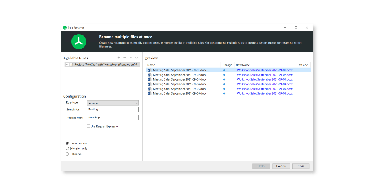 First, you select the files you would like to rename, either via the scan or the search function. Then, you simply enter your rules for the Bulk Renaming and you are good to go.