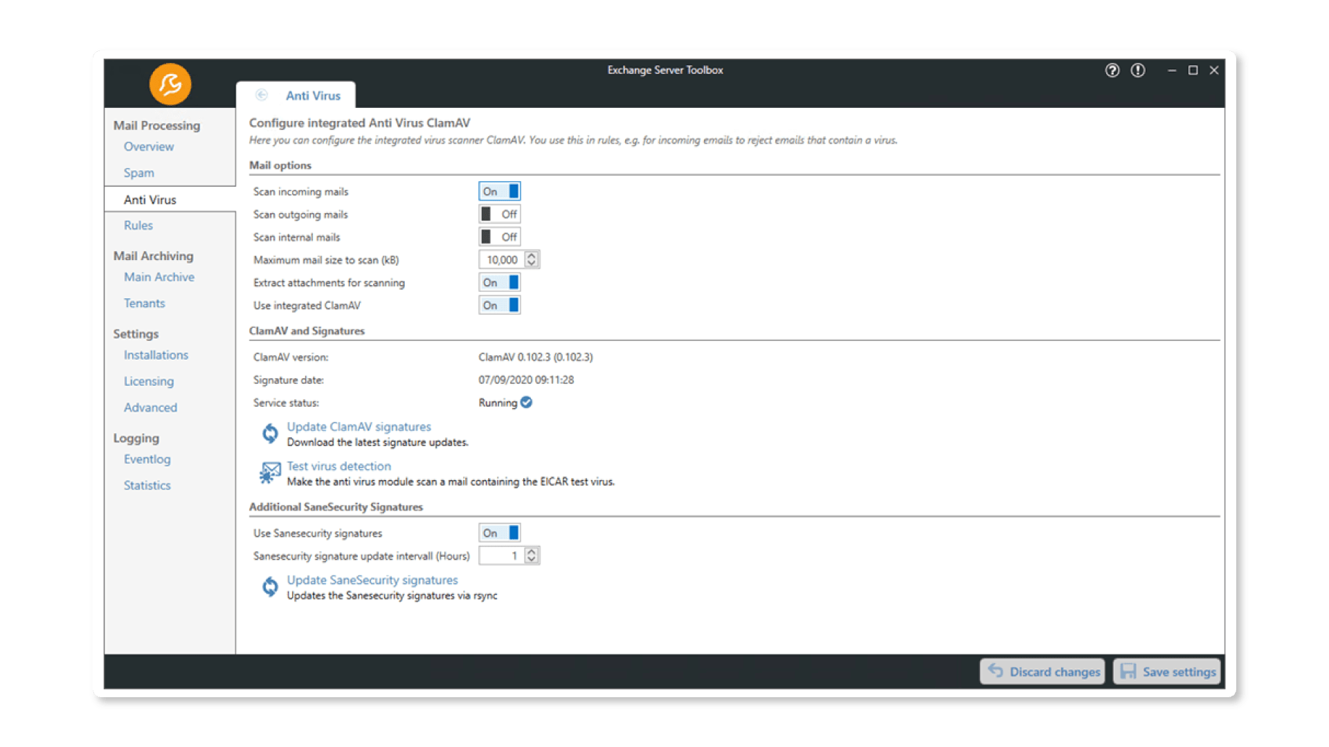 The virus scanner is linked to the Exchange Server Toolbox ruleset and can be flexibly extended with additional software.