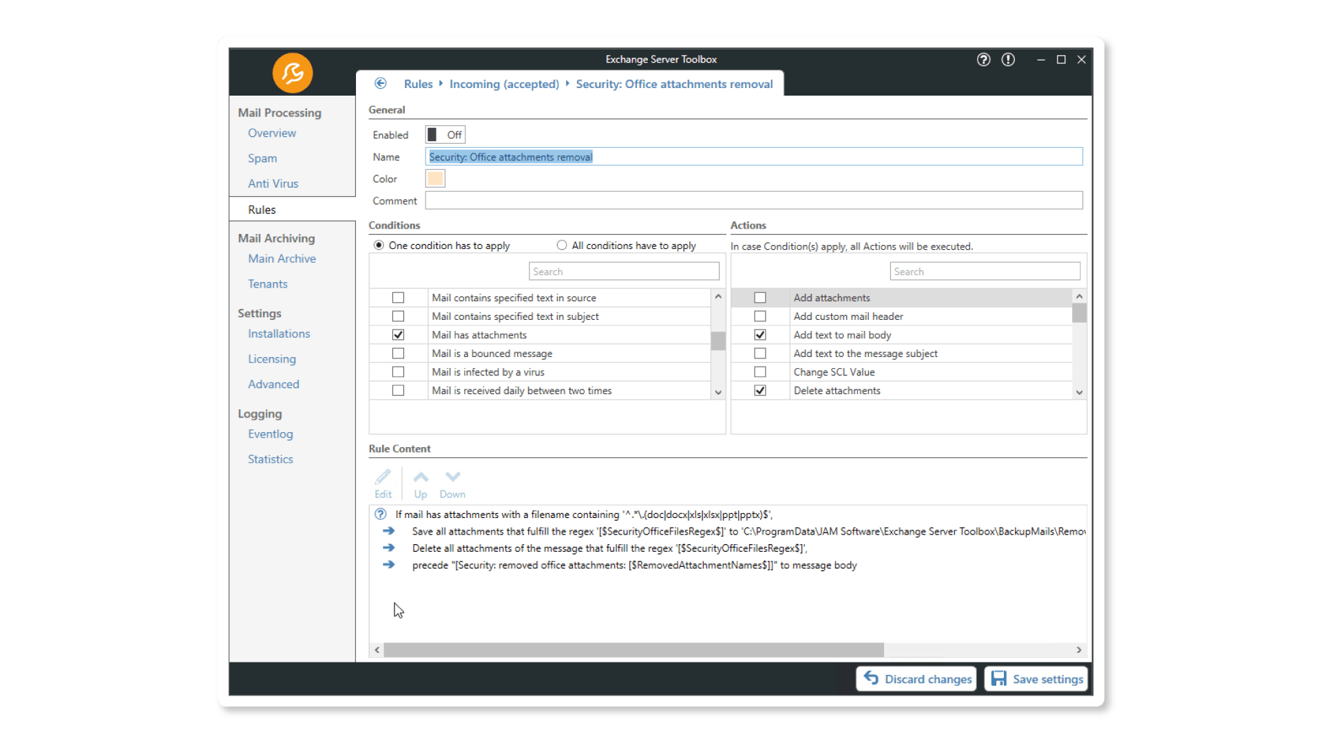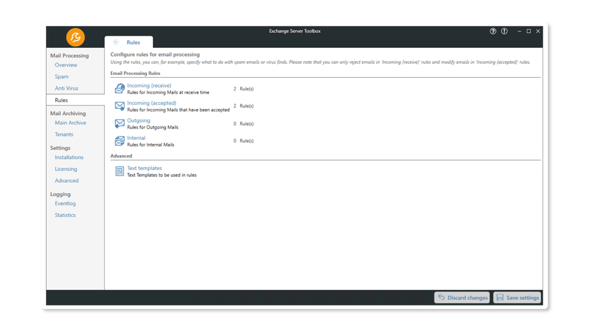 The Exchange Server Toolbox has a global set of rules that can be individually configured. Here you can specify what should happen to incoming, outgoing and internal emails.