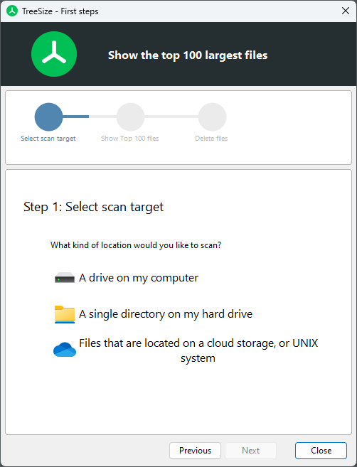 TreeSize is a powerful tool with many possibilities. To make it easy for even casual users to work with TreeSize, our TreeSize Wizard gives you tips for your first steps.