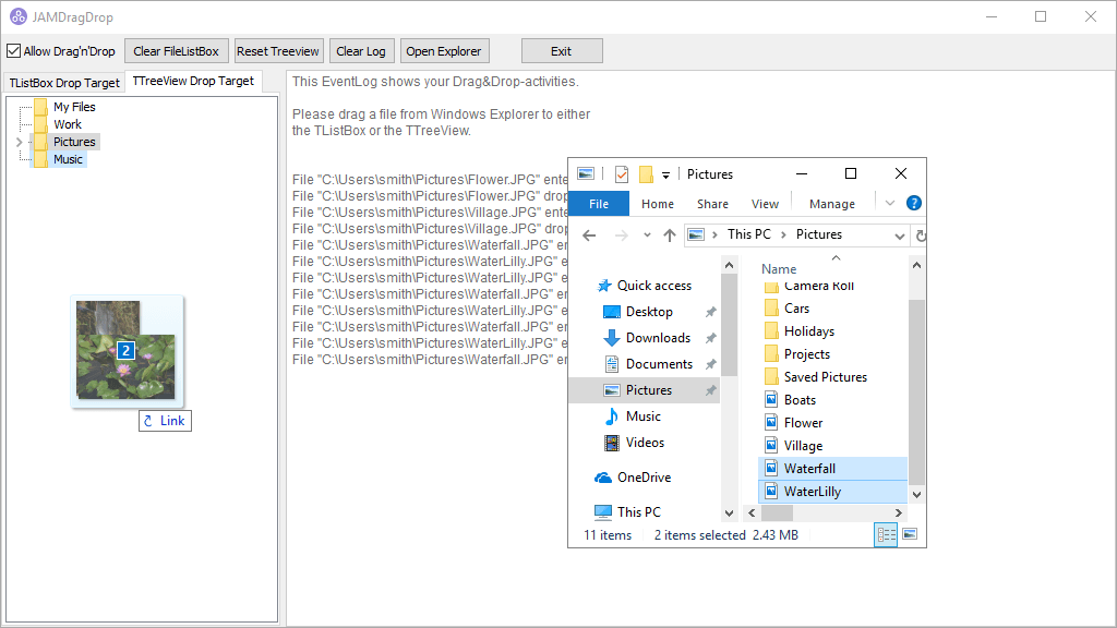 JAMExplorer is a project showing you how to build an Explorer-like application using the visual shell controls of the ShellBrowser component suite. On the left pane, you see the Windows TreeView, on the right pane the contents of the current folder are displayed. The toolbar contains some of the usual Explorer buttons like delete, properties, small/large icons. When a user right-clicks on an item, the context menu is displayed. All items can be renamed, Drag&Drop operations are supported. The only extra code written for this sample project were the handlers for the SpeedButtons in the toolbar of the window (usually one line for each button).