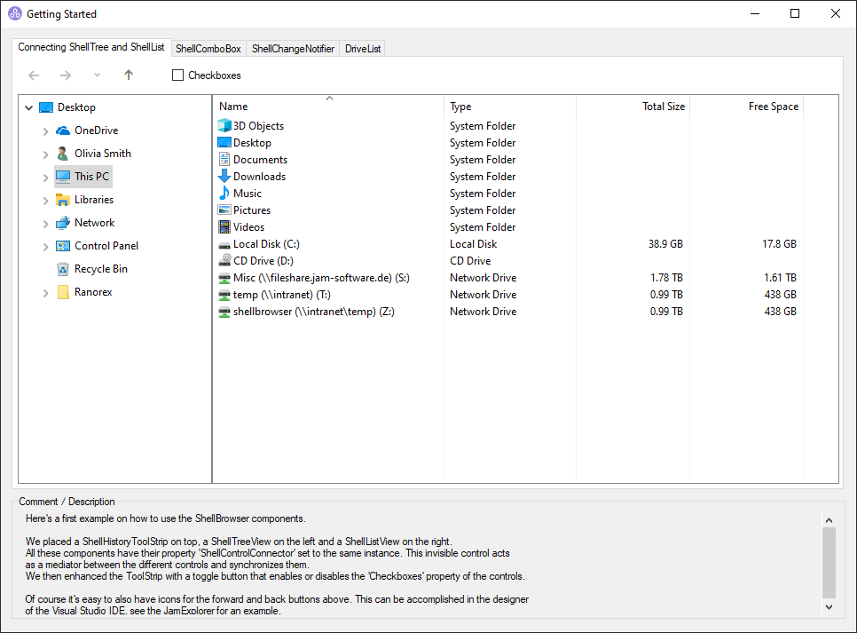 Here's a first example on how to use the ShellBrowser components. We placed a JamShellTree on the left and a JamShellList on the right side. Both components' property 'Shelllink' is set to the same instance of a JamShellLink, a synchronizing component. The form was enhanced with a check for box enabling or disabling the 'Checkboxes' property of the components as well as forward/backward buttons.