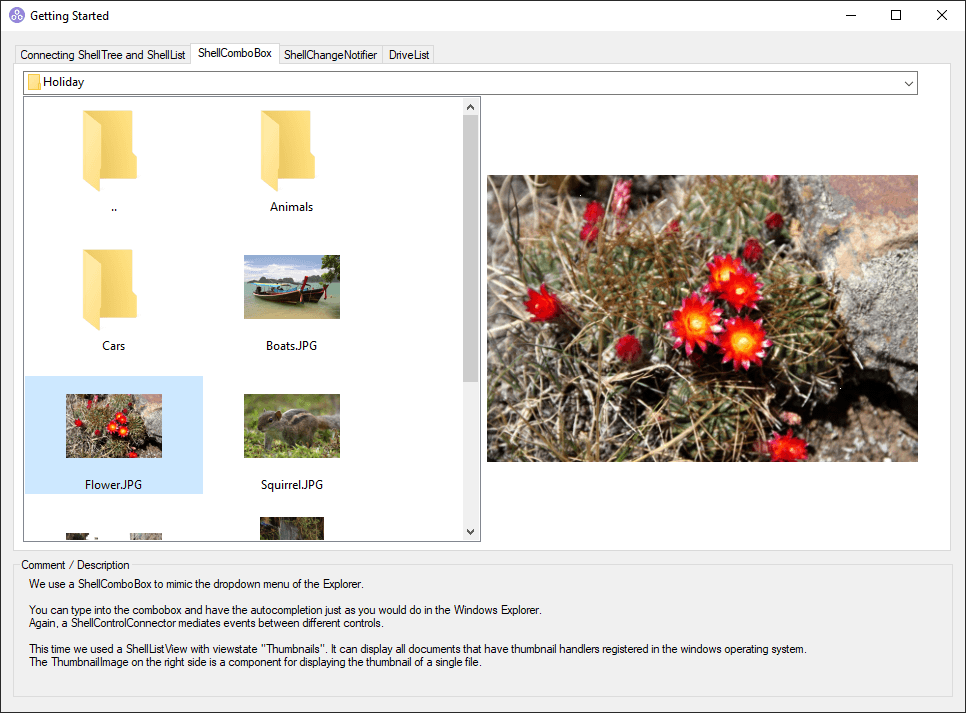A JamShellCombo mimics the dropdown menu of the Windows Explorer. Users can type into the combobox and use the autocomplete feature. A JamShellLink mediates events between different components. This time we placed a JamThumbnailImage component on the right side to display all documents known to the Windows operating system as a preview. The 'SpecialFolder' property of the JamShellList has been set to 'MyPictures', one of the available default locations.