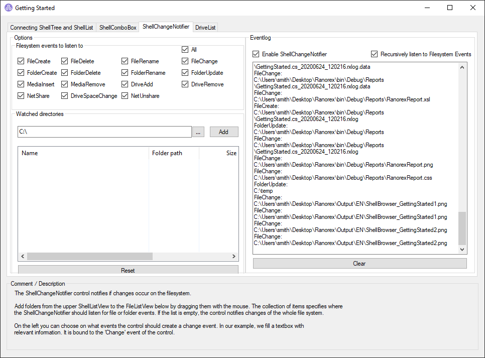 The JamShellChangeNotifier component notifies if changes occur on the filesystem. Add folders from the JamShellList to the JamFileList by dragging them with the mouse. The collection of items specifies where the JamShellChangeNotifier should listen for file or folder events. If the list is empty, the component notifies changes of the whole file system. On the left you can choose on what events the component should create a change event. In our example a textbox contains relevant information. It is bound to the 'Change' event of the component.