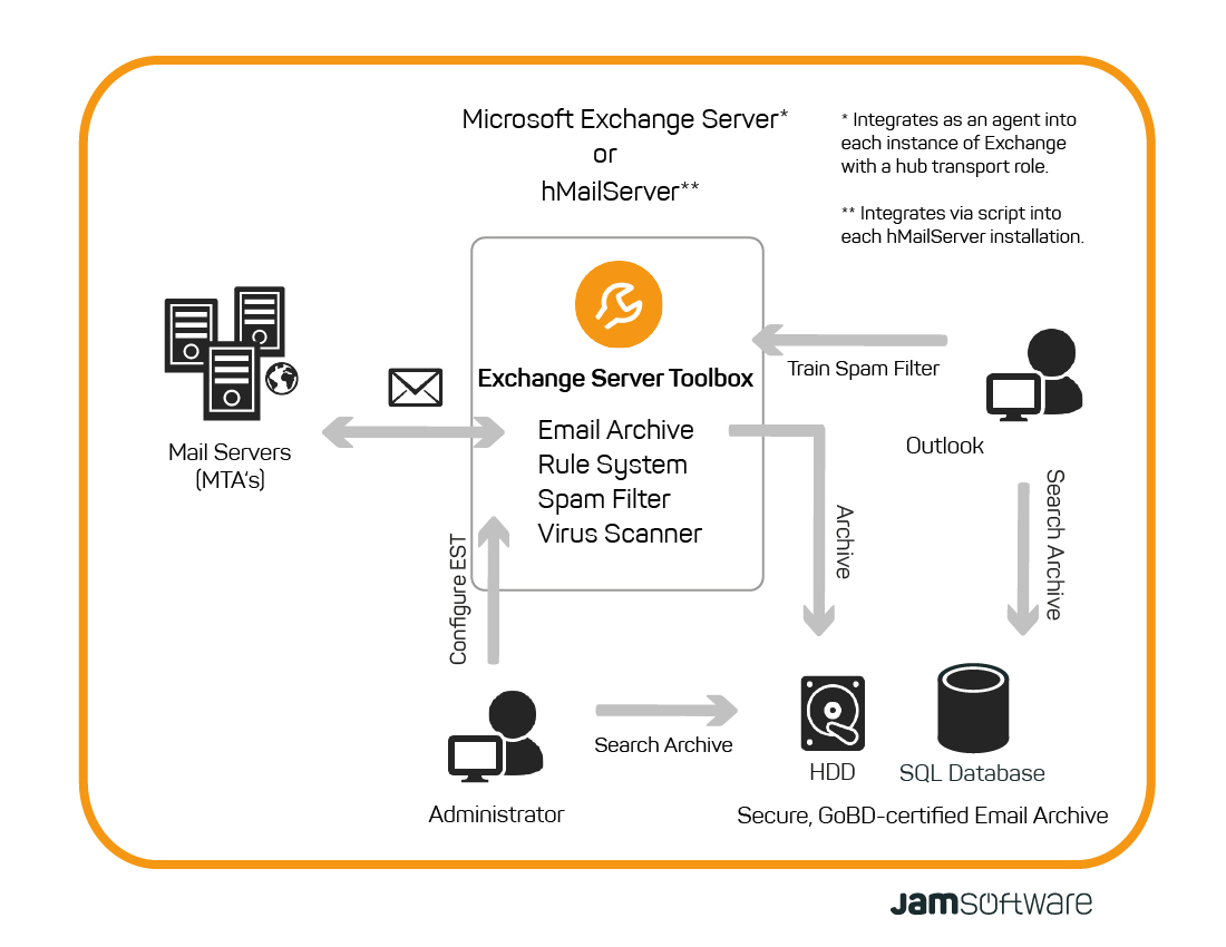The spam filter SpamAssassin is included in Exchange Server Toolbox and checks incoming emails for signs of spam. Emails rated as spam are not accepted by the server (Microsoft Exchange 2007 and higher) or sent to the spam folders. Emails with a certain spam probability are marked as possible spam and sent to the recipient.