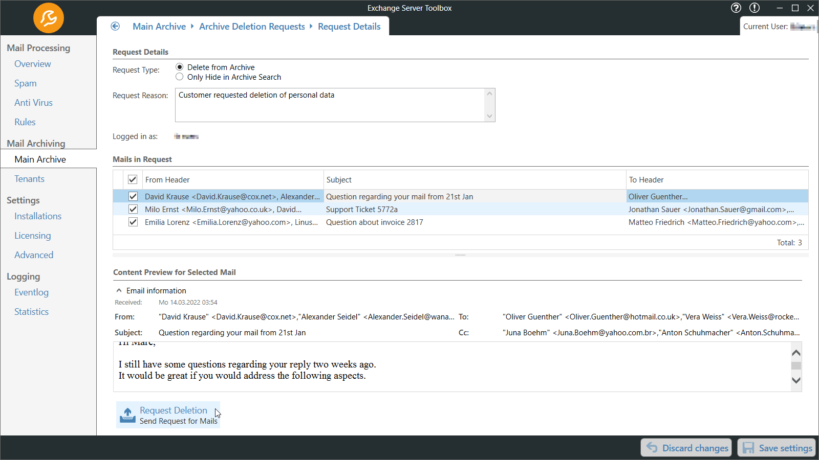 The four-eyes deletion principle helps to remove emails from the archive, GDPR-compliant.