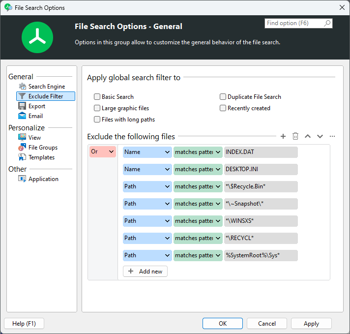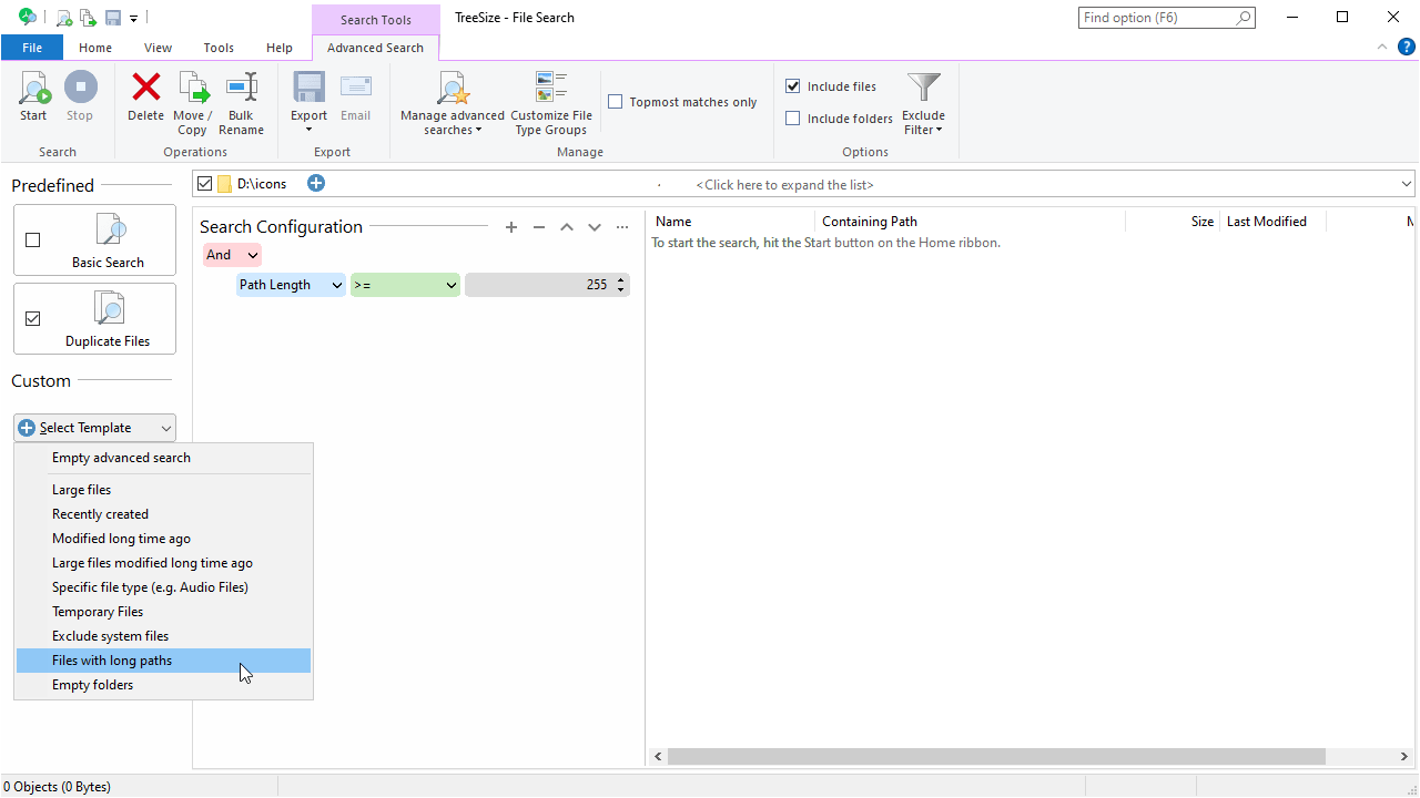 The TreeSize file search helps you to find obsolete and very large files. The particular search types can be configured in detail and certain files or folders can be easily excluded from the search results - for instance recently changed files.