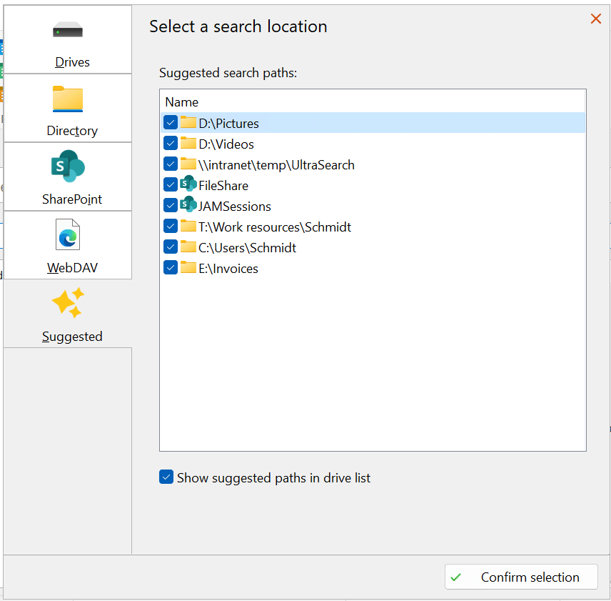 With the help of suggestions, UltraSearch can include a number of individual target paths and thus improve the quality of the results. Suggestions can refer to your local hard disk, but also to connected network drives or files in SharePoint.