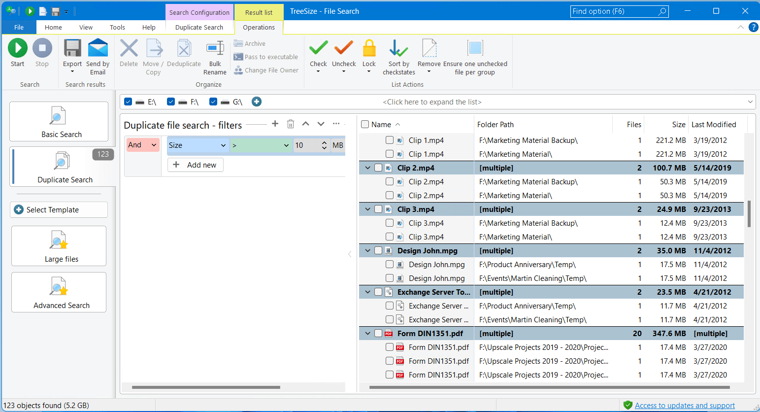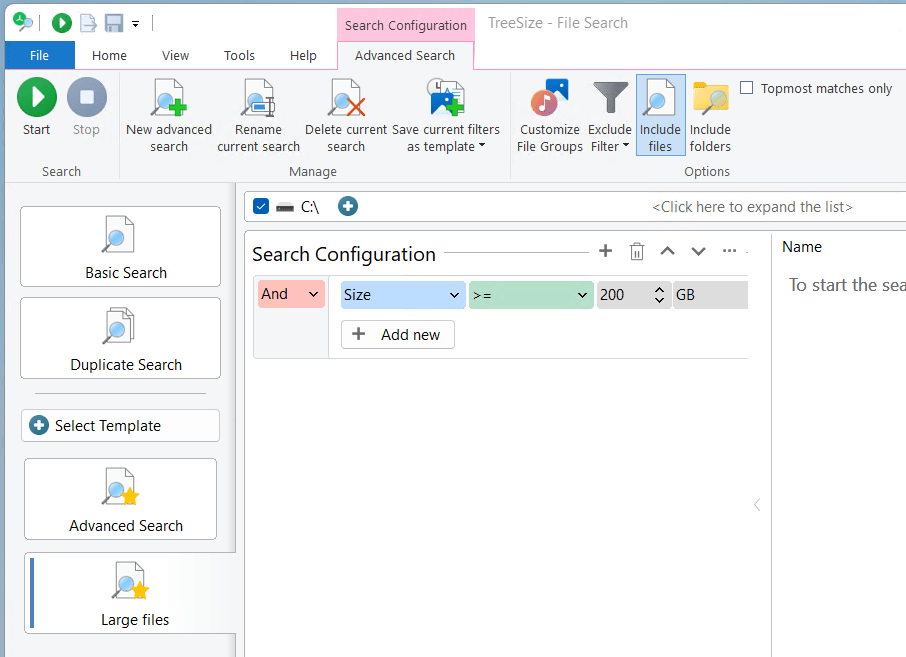 In the TreeSize file search, you will find your own search template to quickly search for large files. Here you can also specify, for example, that only large files that were last edited a long time ago should be included.