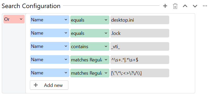 Let's take a closer look at the search configuration. First, we see five different filters applied to the file name, all connected with an OR operator. This means that only one of the criteria needs to match to identify a file.