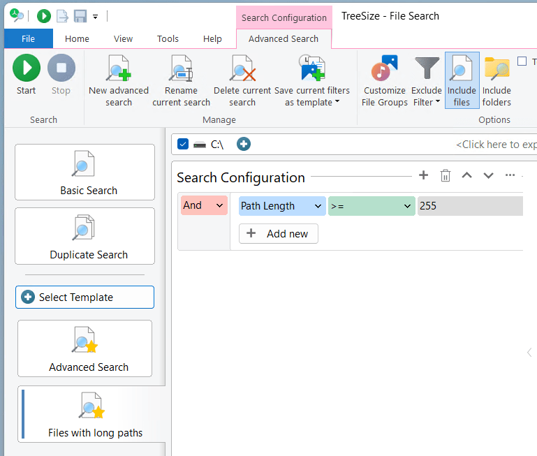 Again, the TreeSize file search can help with a search template provided. Select the template "Files with long paths" and start the search.