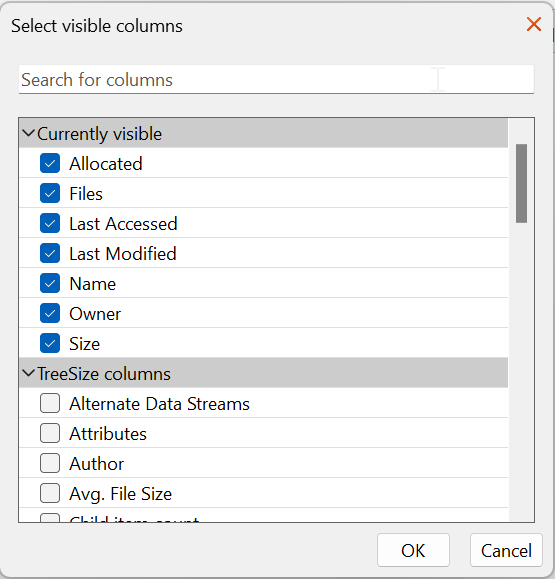 From now on, additional columns will be grouped into topics such as "TreeSize columns", "Users" or "File types" and sorted by relevance. At the top, you will find all currently visible meta information organized in a separate group.