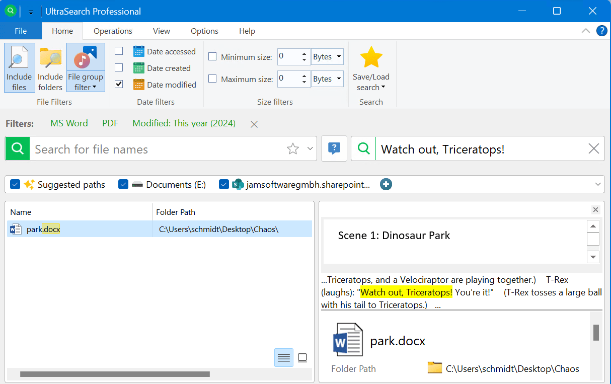 UltraSearch scans through all selected target paths to find the text excerpt you're searching for. The algorithm processes plain text, source code such as HTML or Python, as well as Office documents like Word, Excel, PowerPoint, and PDFs