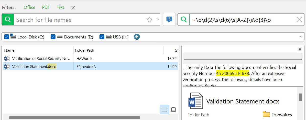 With UltraSearch you can quickly solve this problem by using a regular expression to search specifically for the defined structure of the numbers. To do this, place a tilde "~" in front of your regular expression: