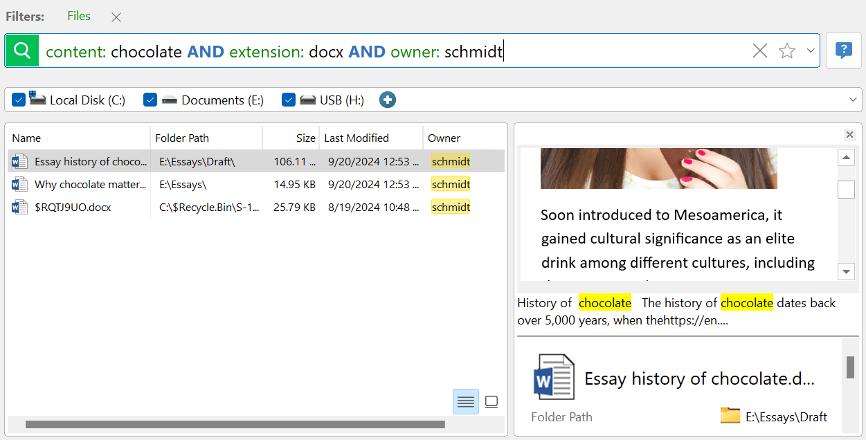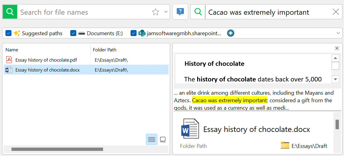Instantly, UltraSearch presents all files found in a list view like in Windows Explorer. Thumbnails and a small preview of the content then help to identify the correct file. The text excerpt you are looking for is displayed with a highlight along with the context.