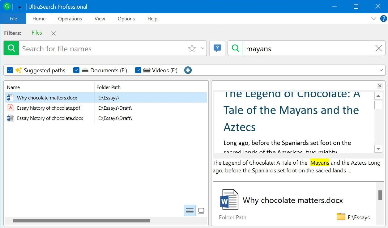 You simply enter a known content snippet of a file you are looking for and UltraSearch immediately starts searching on the selected target paths.