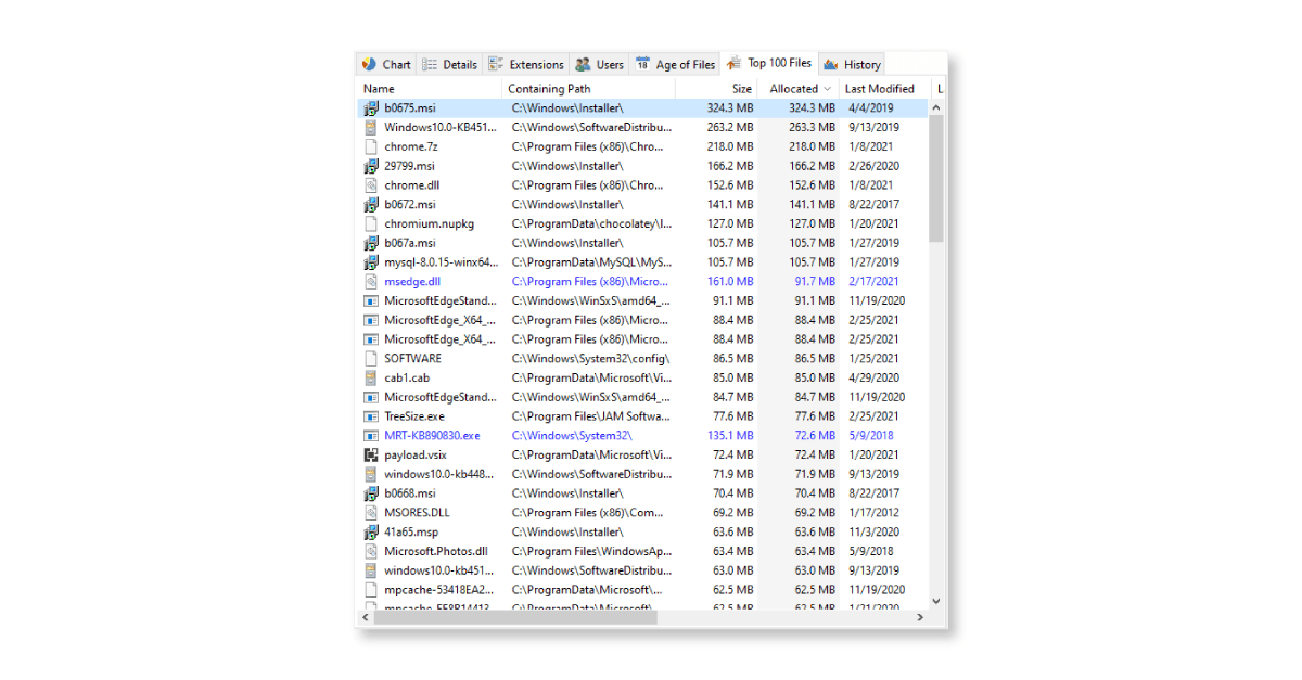 Sebastian: I fancy the TreeSize’s Top 100 Files option. I like to look for singular big files to delete instead of a bunch of small ones first. So, this option helps me a lot. I also like the history view, it helps me identify patterns on my disk usage.