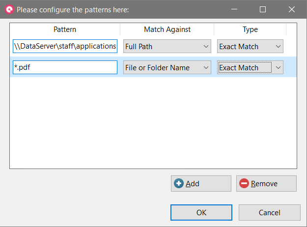 The most common format for applications and resumes is PDF. So, let's create a filter that affects all PDF documents in the "Applications" subfolder on the Human Resources file server (\\DataServer\staff\applications).
