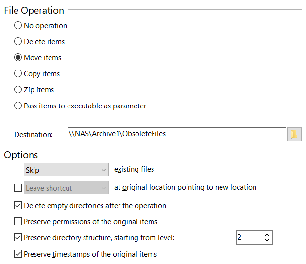So, as usual, let's set a maximum lifetime for the corresponding project files and then select "Move items" in the file operations. Here, we can specify in the options exactly to which destination the files should be moved.