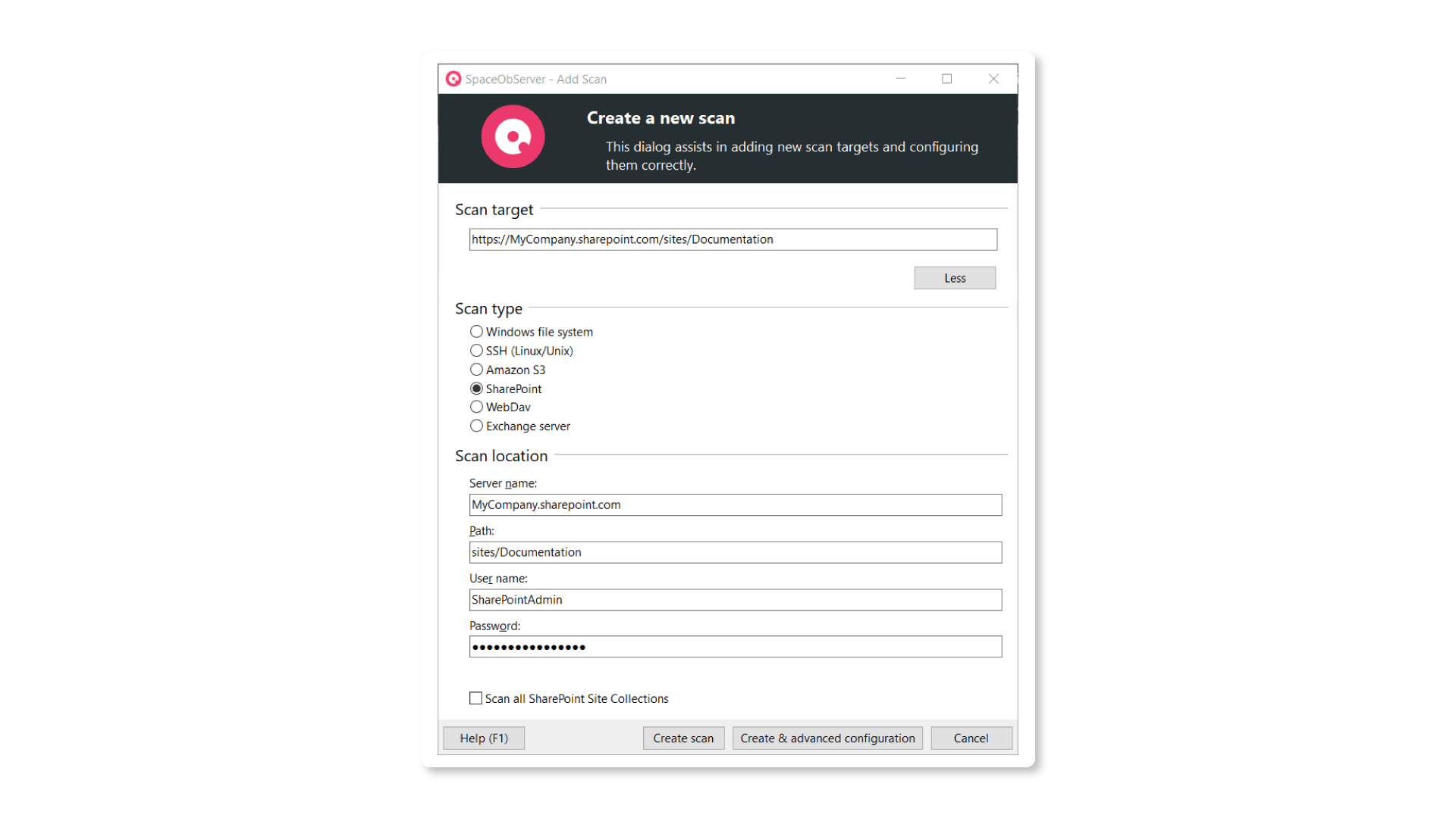 First things first. To perform DLM with SpaceObServer, start by setting up a regular server scan on your server. Windows server, SharePoint, Amazon S3 Cloud Storage and Linux server are supported.