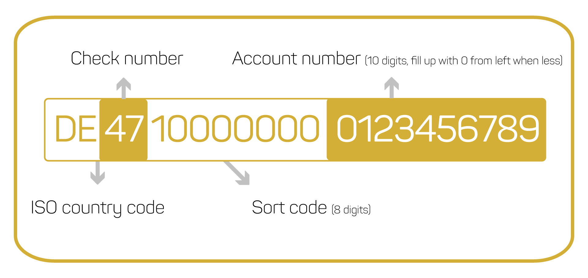In the SEPA system, the traditional bank account number is replaced by the IBAN, the so-called International Bank Account Number. The IBAN can be calculated from the sort code and the account number.